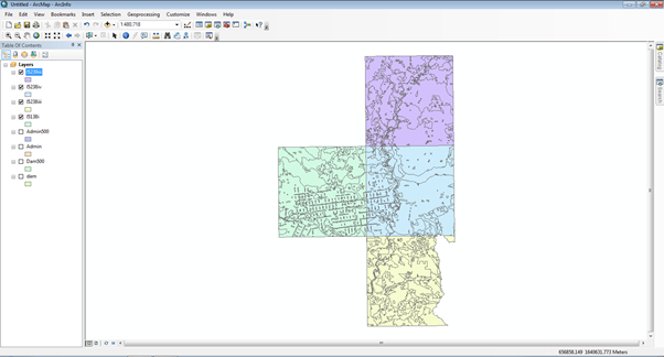 4 ระวางเข้าด้วยกัน โดยไปที่ Geoprocessing ที่เมนูบาร์ แล้วไปที่ Merge4.เมื่อทำการ Merge เสร็จเรียบร้อยแล้ว ข้อมูลทั้ง4 จะถูกรวมกันเป็นเพียงข้อมูลเดียว